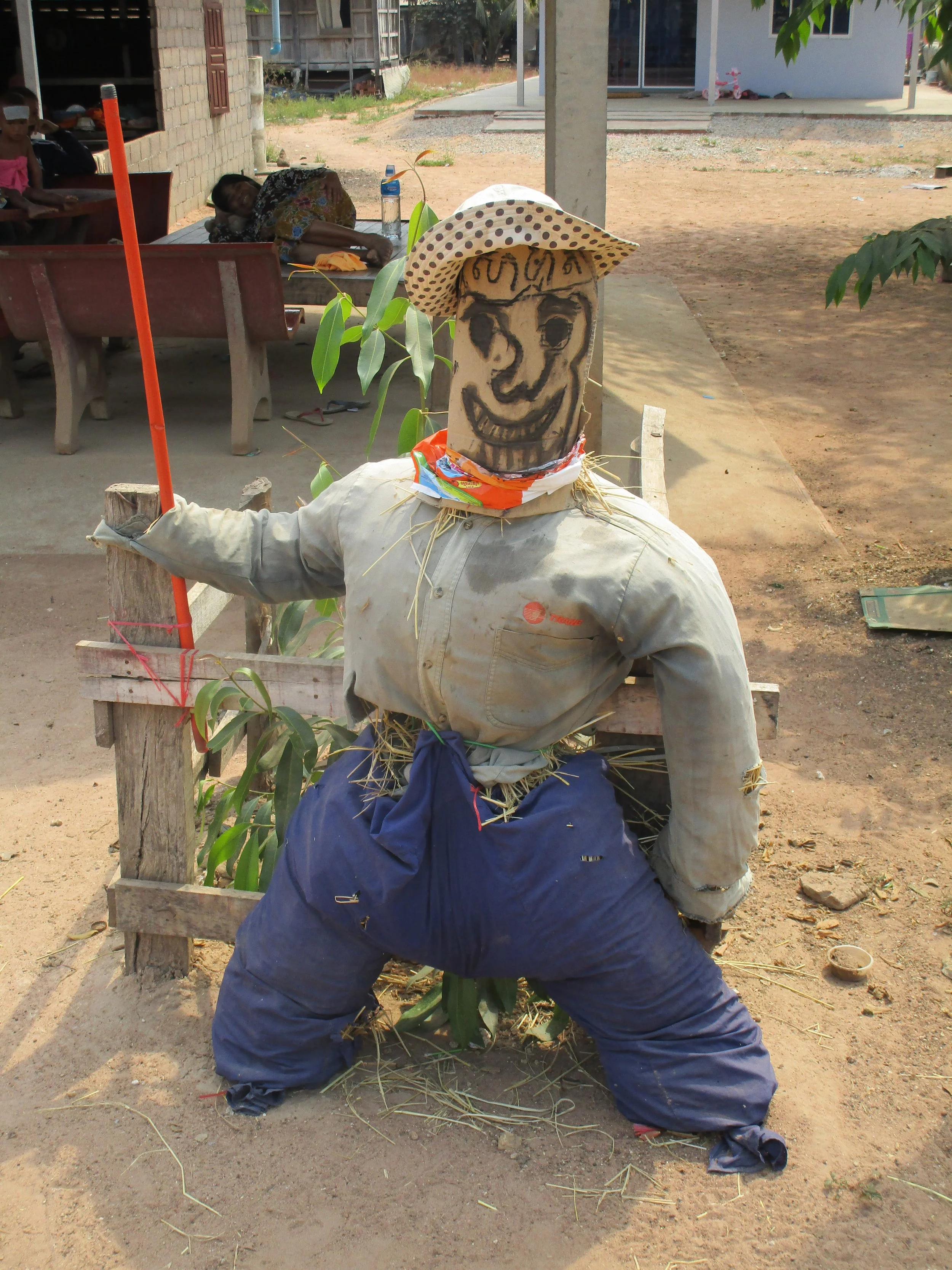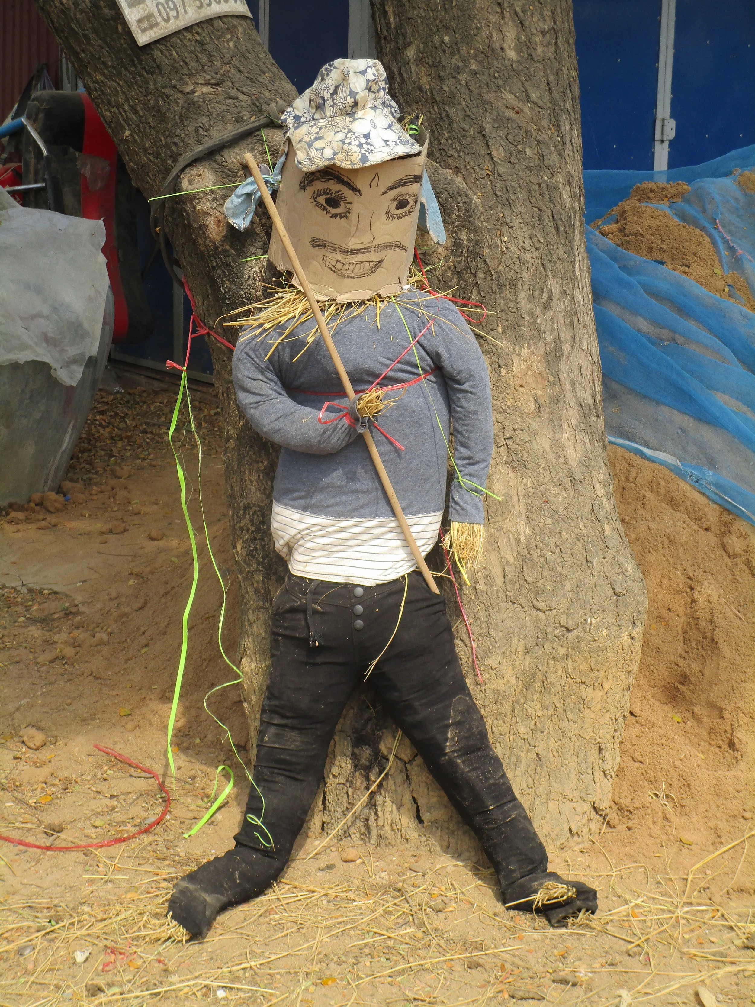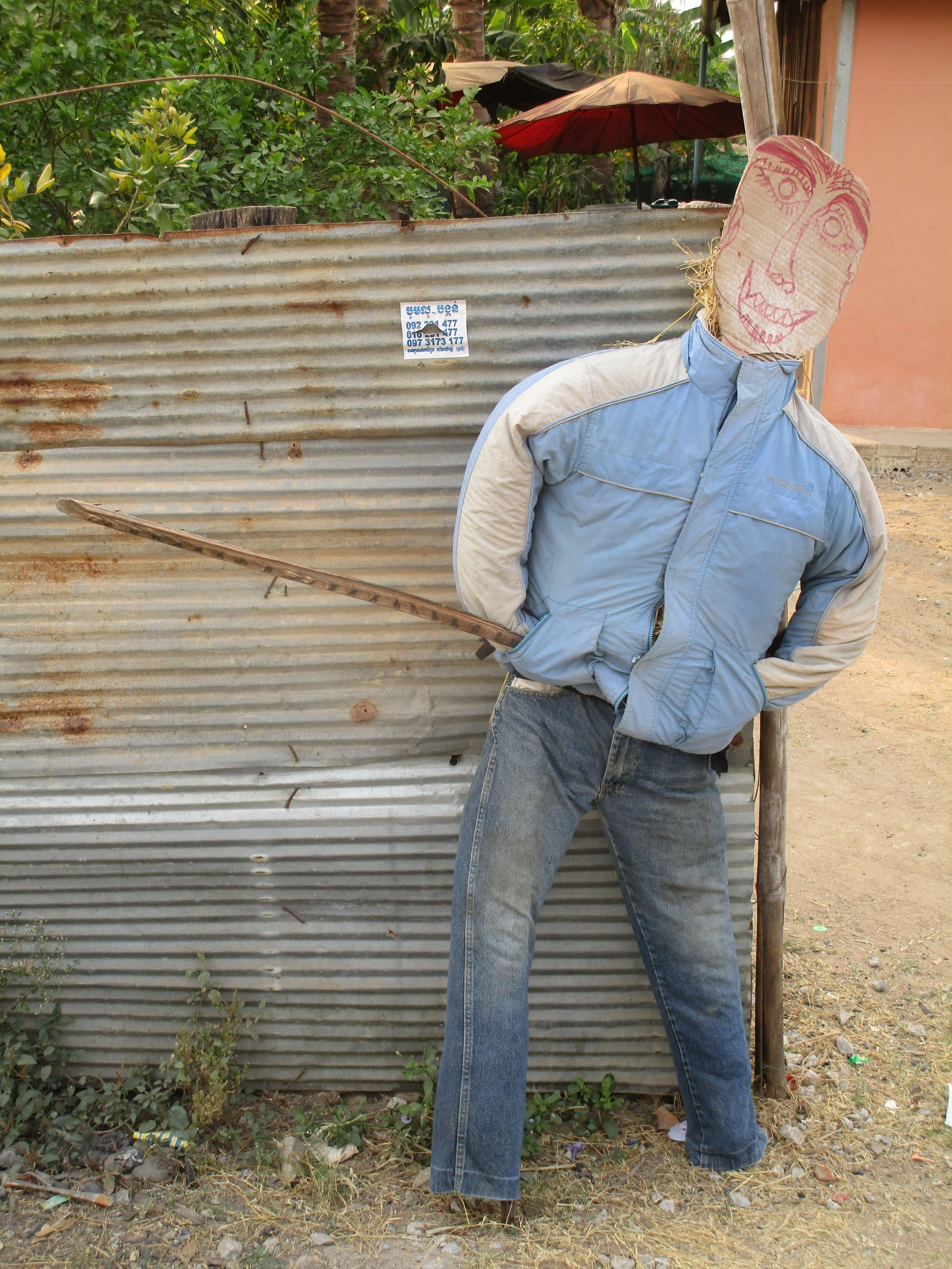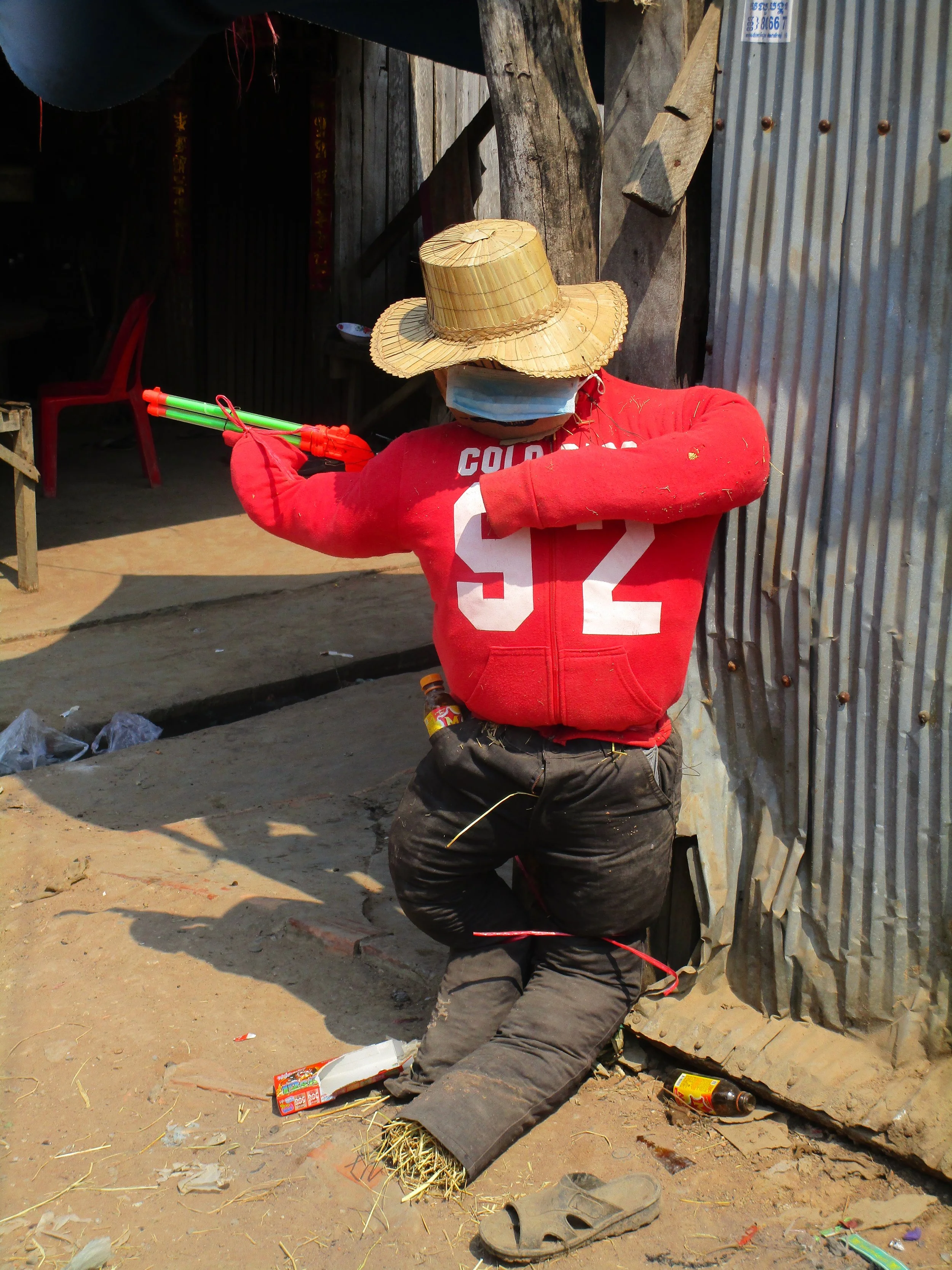 In January 2020, before Covid locked down the world, I went to Bantheay Chmaar, in Northern Cambodia. This was January 21st, 2020. I found the village, a tiny place, full of scarecrows. But these were not meant to frighten birds. That job was done by plastic bags on sticks. No, these were meant to ward off the new disease. Three young men has come back from Bangkok, weeks before, and died of a new disease. Except, their elders said they had seen it before, and the elders did not catch it.