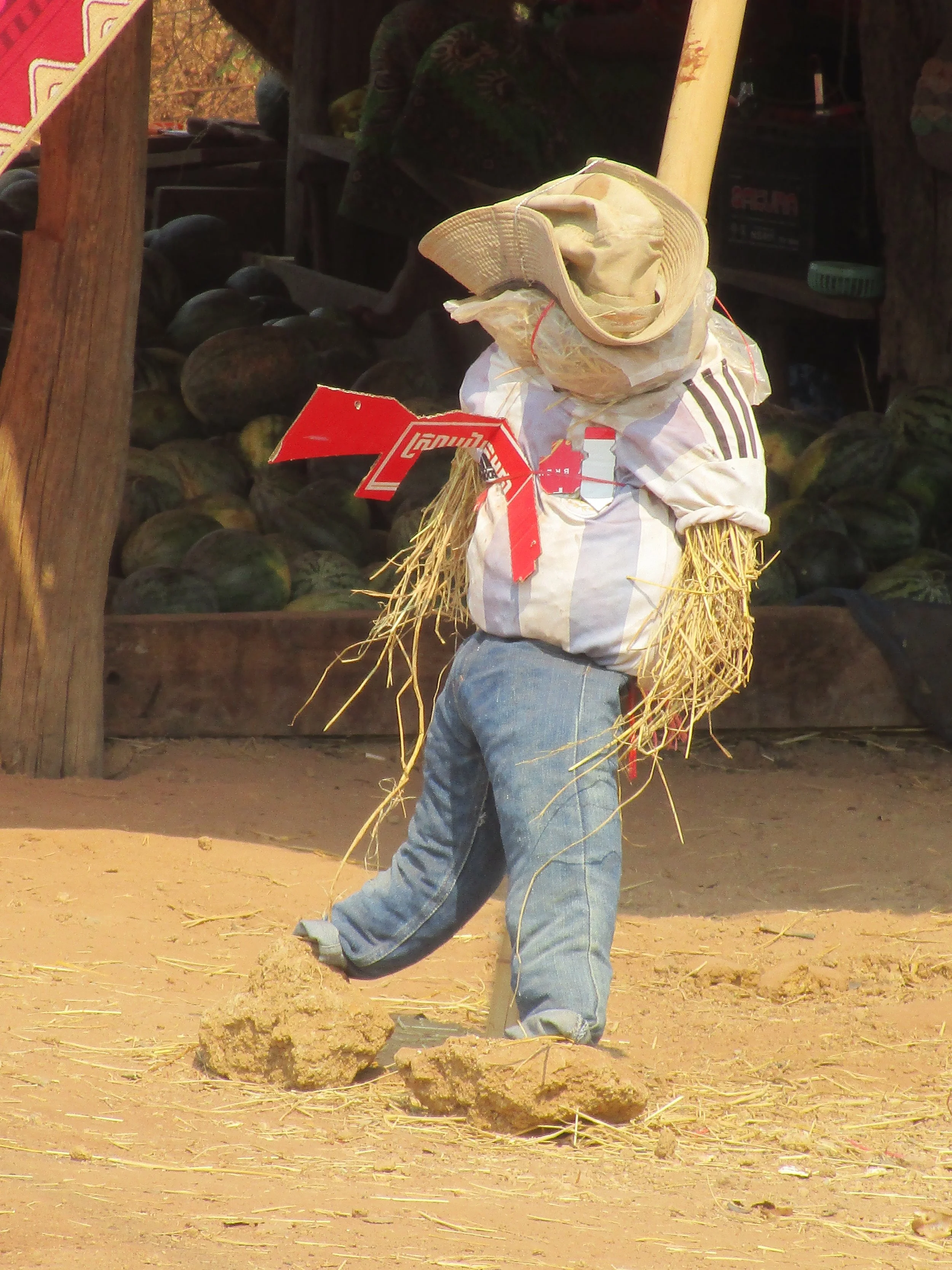 Spiritually, the scarecrows are complex objects. They are always found at the gates of the home compound, facing out. They are not spoken of: I had to find the town skeptic to explain them. To work, they must be scarier than the spirit of the disease. This is why so many of them have moustaches: they look like French people.
